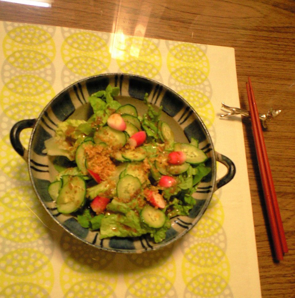 サラダは、山形から貰ったレタス、山梨から貰ったキュウリ、そして私たちがベランダで育てた二十日