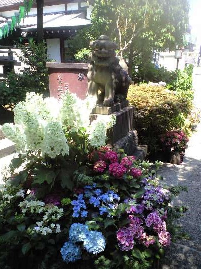 どりの紫陽花で飾られた狛犬